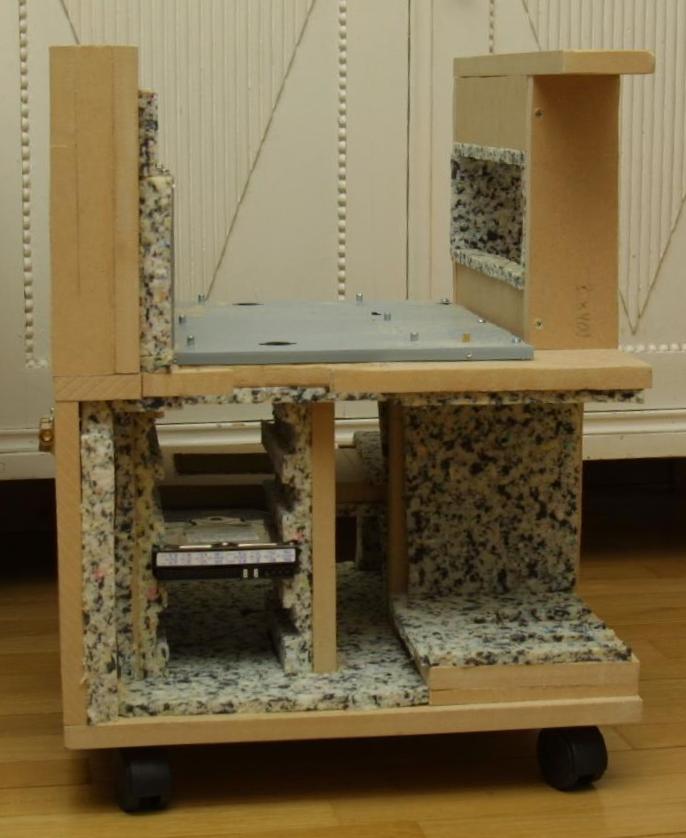 The lower part of the case handles CD's, floppys, the PSU and the disks. The disks are mounted in foam only. This actually got to be very stable and they do not shake out even if I tilt and shake the box. The CD and floppy holders are leftover parts from the previously cut up ATX box and they too are fixed only in foam as well.