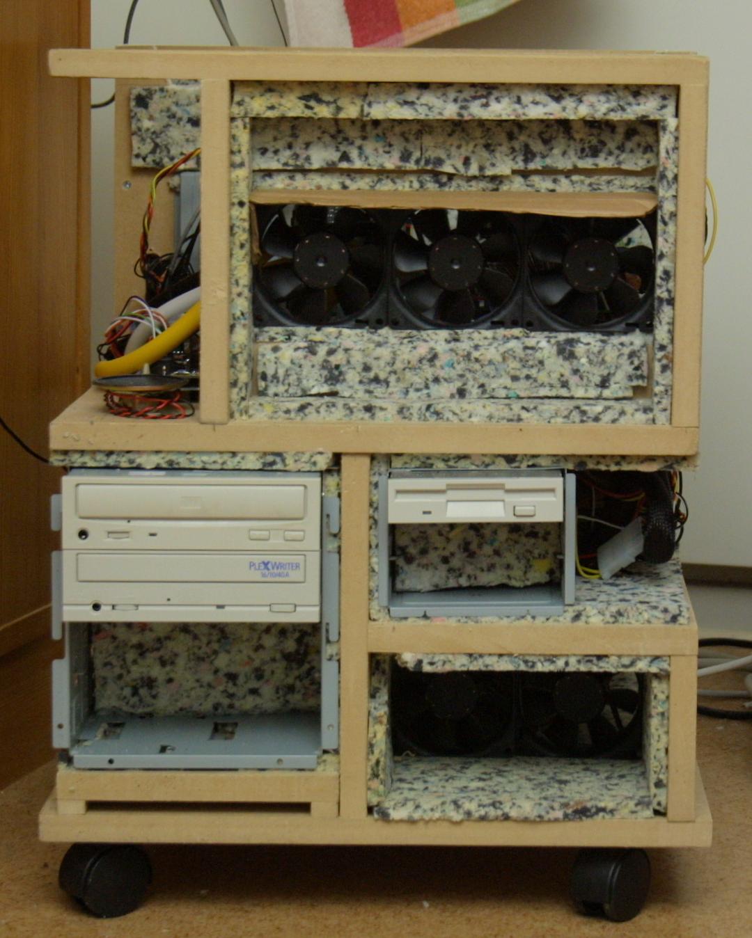 As seen from the front. Metal cradles for the CD and floppy from the cut up ATX case. 5 Papst fans. And wheels.